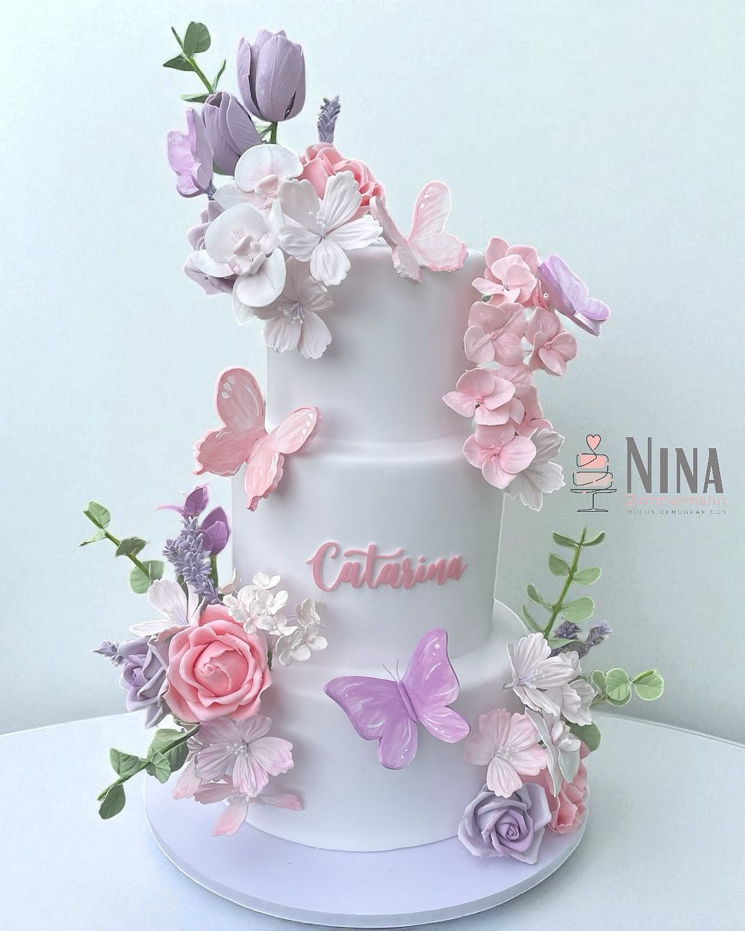 Bolo Jardim Encantado, ideal para aniversários delicados e cheios de charme. Com flores artesanais em tons de rosa e lilás, borboletas realistas e acabamento impecável, esse bolo transmite leveza e sofisticação.